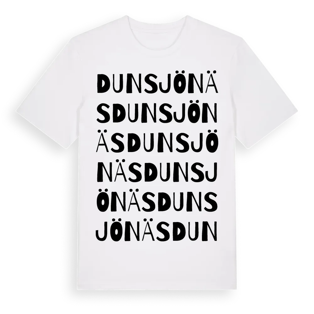 Dunsjönäs ordlek t-shirt är inspirerad av Dunsjönäs i Kalmar län, Sverige. Tröjan är designad för dig som har en speciell koppling till platsen – oavsett om du bor här, har rötterna här eller bara älskar Dunsjönäs.
