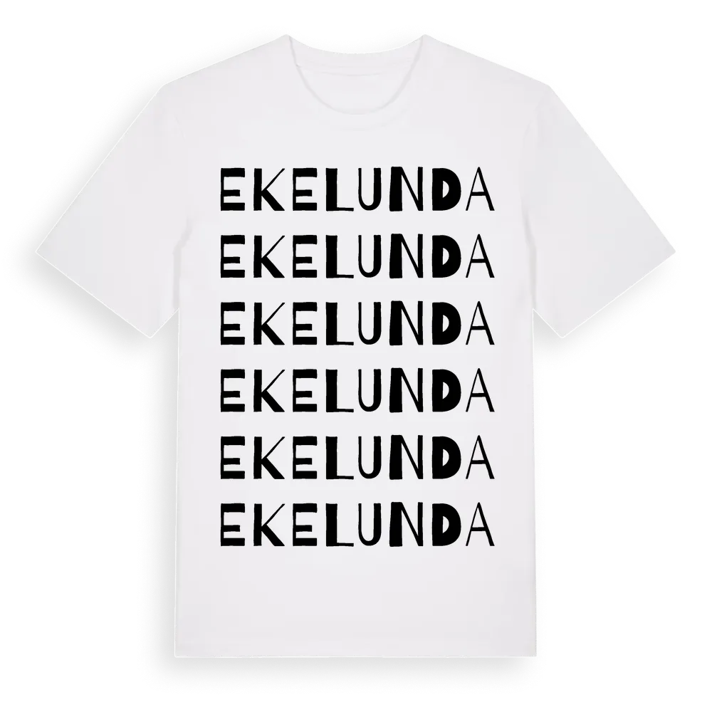 Ekelunda ordlek t-shirt är inspirerad av byn Ekelunda i Kalmar län, Sverige. Tröjan är designad för dig som har en speciell koppling till platsen – oavsett om du bor här, har rötterna här eller bara älskar Ekelunda.