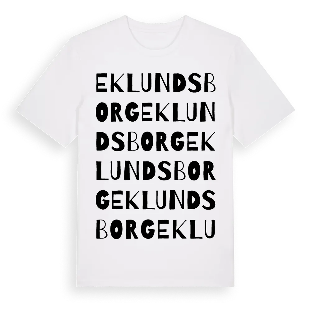 Eklundsborg ordlek t-shirt är inspirerad av Eklundsborg i Kalmar län, Sverige. Tröjan är designad för dig som har en speciell koppling till platsen – oavsett om du bor här, har rötterna här eller bara älskar Eklundsborg.