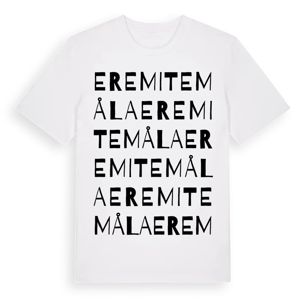 Eremitemåla ordlek t-shirt är inspirerad av byn Eremitemåla i Kalmar län, Sverige. Tröjan är designad för dig som har en speciell koppling till platsen – oavsett om du bor här, har rötterna här eller bara älskar Eremitemåla.