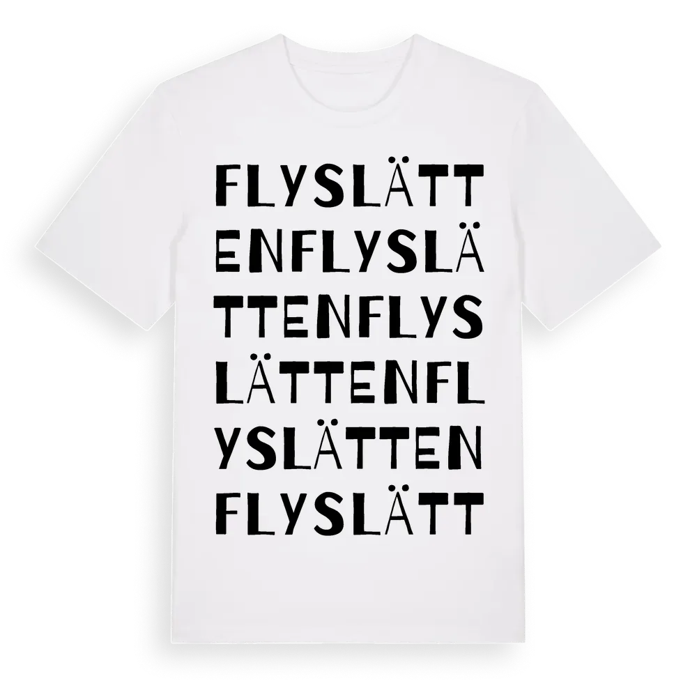 Flyslätten ordlek t-shirt är inspirerad av Flyslätten i Kalmar län, Sverige. Tröjan är designad för dig som har en speciell koppling till platsen – oavsett om du bor här, har rötterna här eller bara älskar Flyslätten.