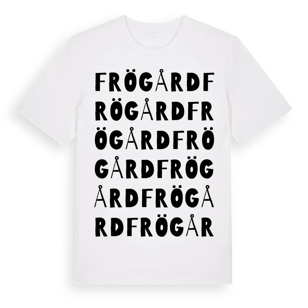 Frögård ordlek t-shirt är inspirerad av Frögård i Kalmar län, Sverige. Tröjan är designad för dig som har en speciell koppling till platsen – oavsett om du bor här, har rötterna här eller bara älskar Frögård.