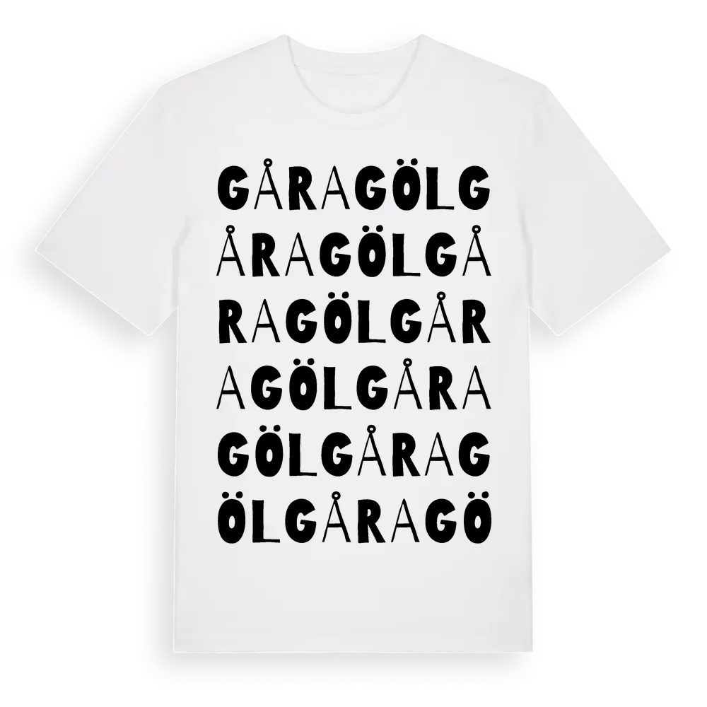 Gåragöl ordlek t-shirt är inspirerad av Gåragöl i Kalmar län, Sverige. Tröjan är designad för dig som har en speciell koppling till platsen – oavsett om du bor här, har rötterna här eller bara älskar Gåragöl.