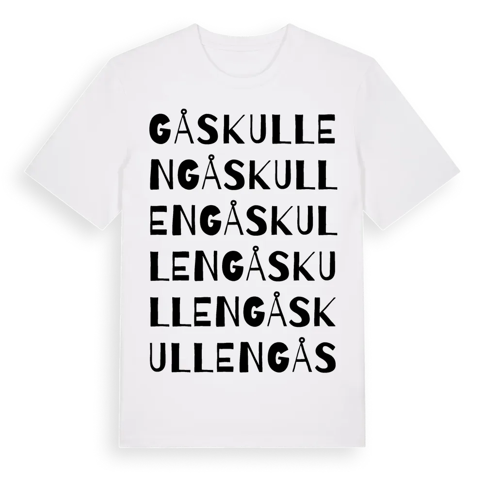 Gåskullen ordlek t-shirt är inspirerad av Gåskullen i Kalmar län, Sverige. Tröjan är designad för dig som har en speciell koppling till platsen – oavsett om du bor här, har rötterna här eller bara älskar Gåskullen.