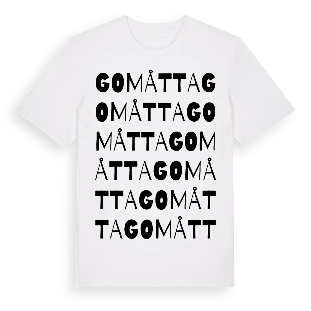 Gomåtta ordlek t-shirt är inspirerad av Gomåtta i Kalmar län, Sverige. Tröjan är designad för dig som har en speciell koppling till platsen – oavsett om du bor här, har rötterna här eller bara älskar Gomåtta.