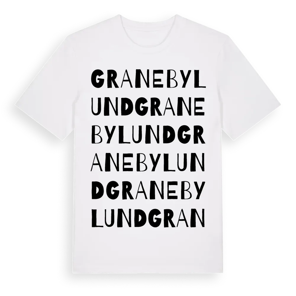 Granebylund ordlek t-shirt är inspirerad av Granebylund i Kalmar län, Sverige. Tröjan är designad för dig som har en speciell koppling till platsen – oavsett om du bor här, har rötterna här eller bara älskar Granebylund.