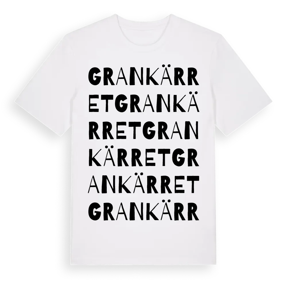 Grankärret ordlek t-shirt är inspirerad av Grankärret i Kalmar län, Sverige. Tröjan är designad för dig som har en speciell koppling till platsen – oavsett om du bor här, har rötterna här eller bara älskar Grankärret.