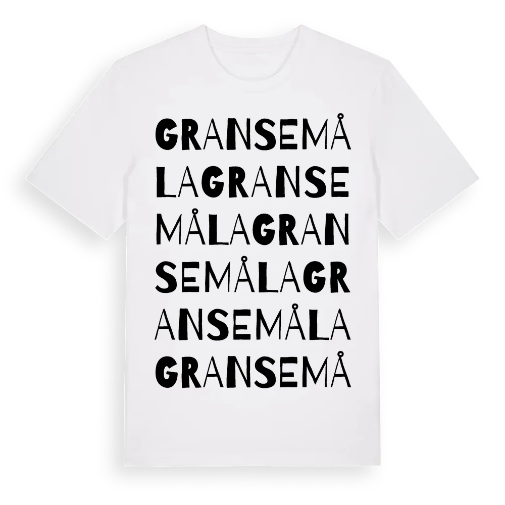 Gransemåla ordlek t-shirt är inspirerad av Gransemåla i Kalmar län, Sverige. Tröjan är designad för dig som har en speciell koppling till platsen – oavsett om du bor här, har rötterna här eller bara älskar Gransemåla.