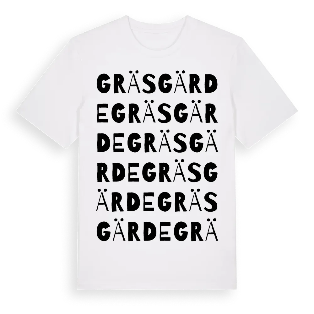 Gräsgärde ordlek t-shirt är inspirerad av byn Gräsgärde i Kalmar län, Sverige. Tröjan är designad för dig som har en speciell koppling till platsen – oavsett om du bor här, har rötterna här eller bara älskar Gräsgärde.