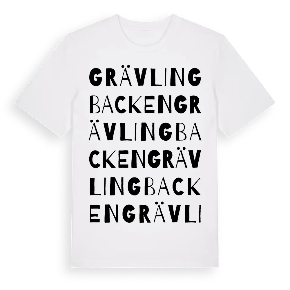 Grävlingbacken ordlek t-shirt är inspirerad av Grävlingbacken i Kalmar län, Sverige. Tröjan är designad för dig som har en speciell koppling till platsen – oavsett om du bor här, har rötterna här eller bara älskar Grävlingbacken.