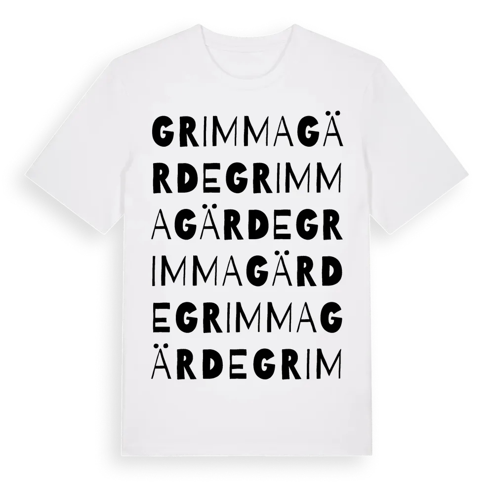 Grimmagärde ordlek t-shirt är inspirerad av byn Grimmagärde i Kalmar län, Sverige. Tröjan är designad för dig som har en speciell koppling till platsen – oavsett om du bor här, har rötterna här eller bara älskar Grimmagärde.