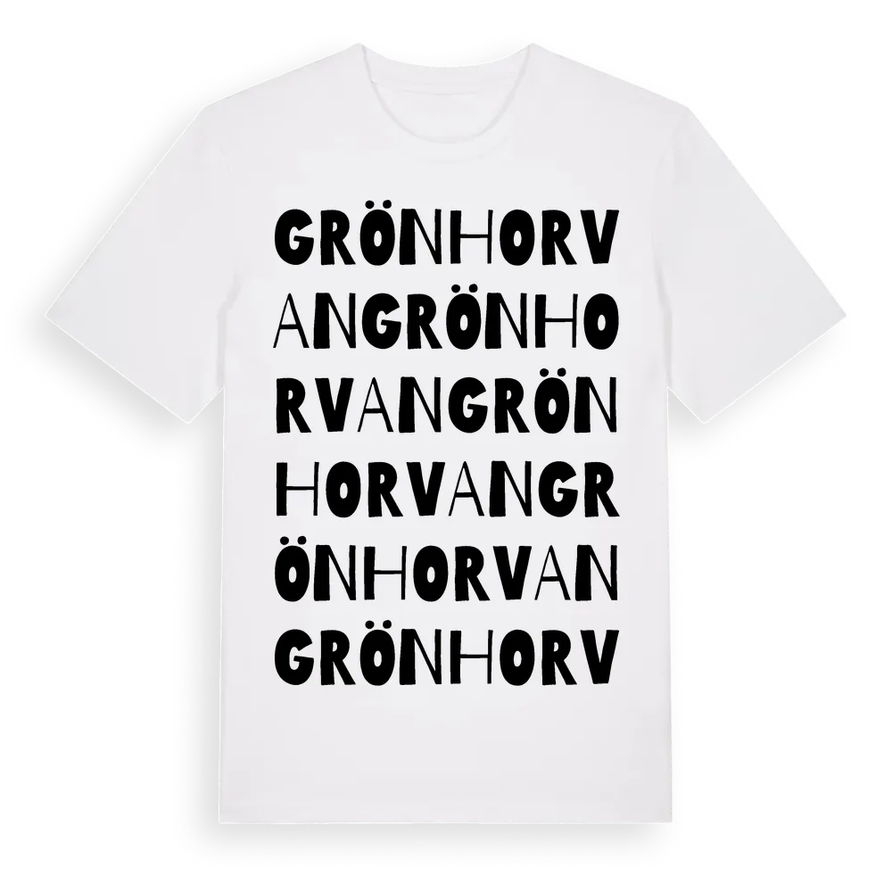 Grönhorvan ordlek t-shirt är inspirerad av Grönhorvan i Kalmar län, Sverige. Tröjan är designad för dig som har en speciell koppling till platsen – oavsett om du bor här, har rötterna här eller bara älskar Grönhorvan.