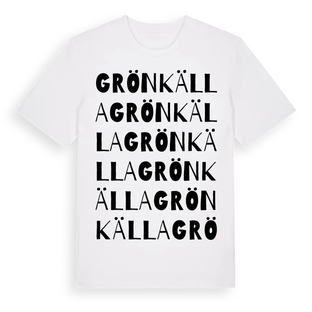 Grönkälla ordlek t-shirt är inspirerad av Grönkälla i Kalmar län, Sverige. Tröjan är designad för dig som har en speciell koppling till platsen – oavsett om du bor här, har rötterna här eller bara älskar Grönkälla.
