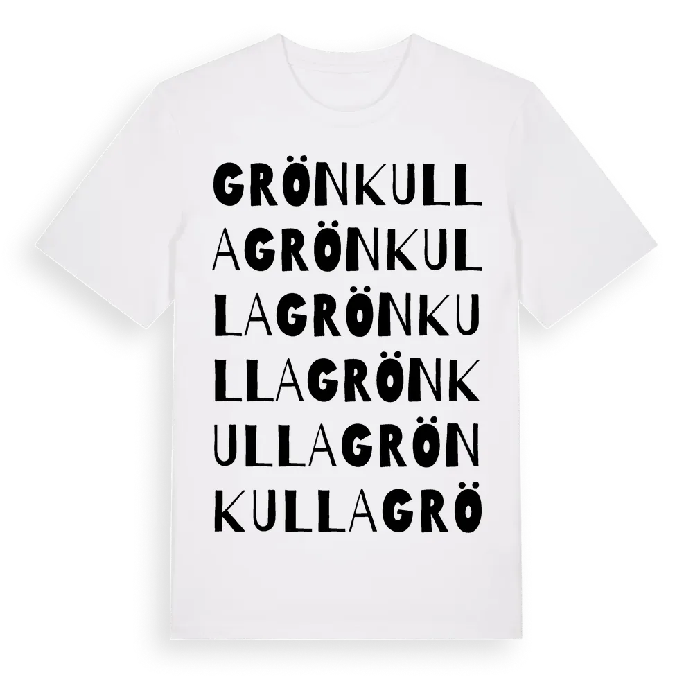 Grönkulla ordlek t-shirt är inspirerad av Grönkulla i Kalmar län, Sverige. Tröjan är designad för dig som har en speciell koppling till platsen – oavsett om du bor här, har rötterna här eller bara älskar Grönkulla.