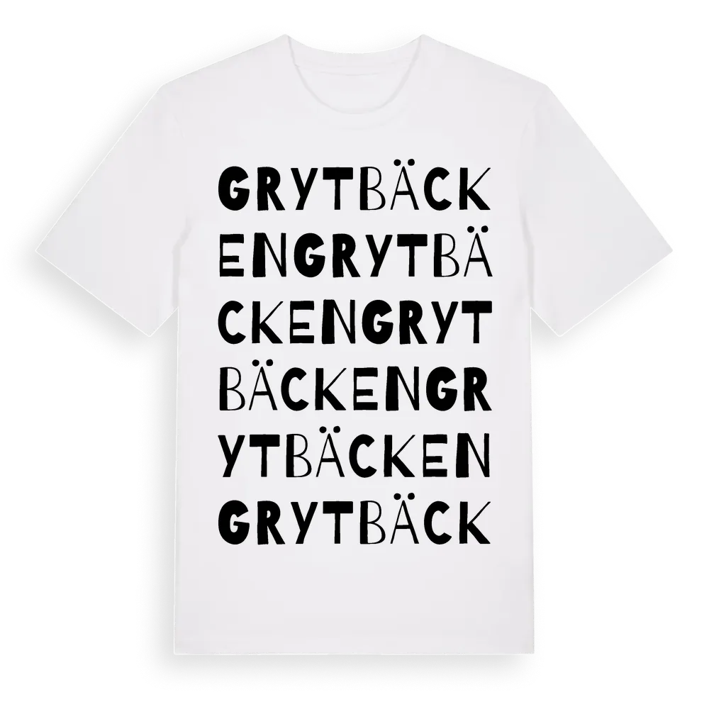 Grytbäcken ordlek t-shirt är inspirerad av byn Grytbäcken i Kalmar län, Sverige. Tröjan är designad för dig som har en speciell koppling till platsen – oavsett om du bor här, har rötterna här eller bara älskar Grytbäcken.