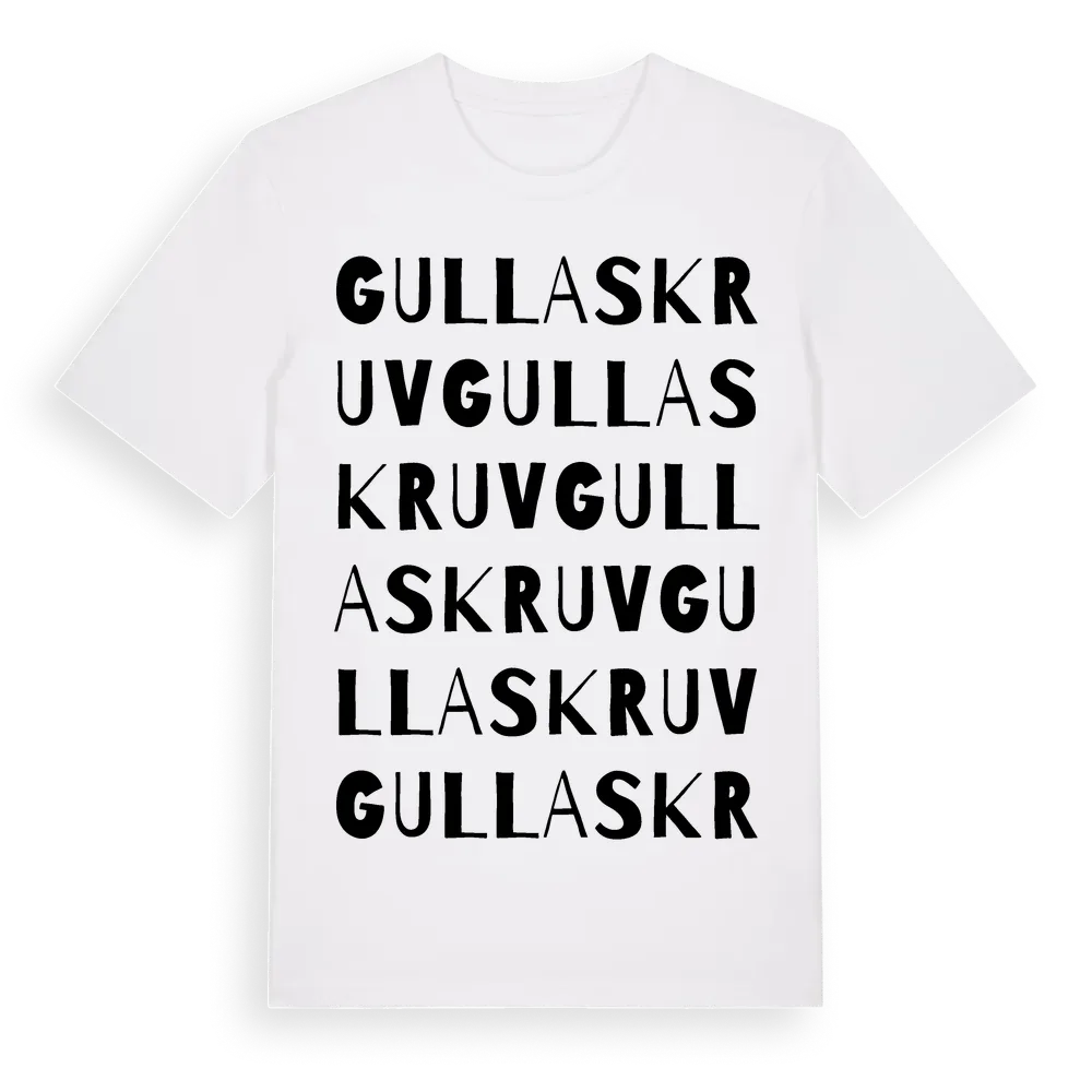 Gullaskruv ordlek t-shirt är inspirerad av byn Gullaskruv i Kalmar län, Sverige. Tröjan är designad för dig som har en speciell koppling till platsen – oavsett om du bor här, har rötterna här eller bara älskar Gullaskruv.