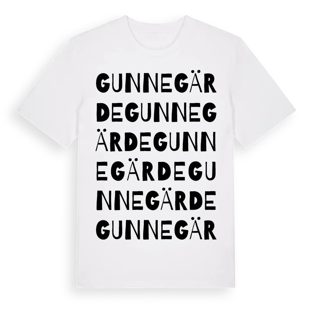 Gunnegärde ordlek t-shirt är inspirerad av byn Gunnegärde i Kalmar län, Sverige. Tröjan är designad för dig som har en speciell koppling till platsen – oavsett om du bor här, har rötterna här eller bara älskar Gunnegärde.