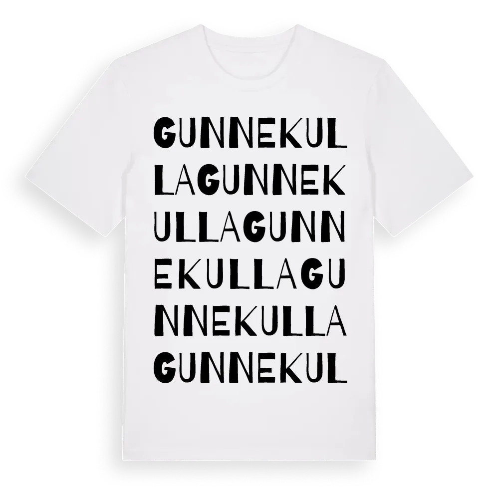 Gunnekulla ordlek t-shirt är inspirerad av byn Gunnekulla i Kalmar län, Sverige. Tröjan är designad för dig som har en speciell koppling till platsen – oavsett om du bor här, har rötterna här eller bara älskar Gunnekulla.