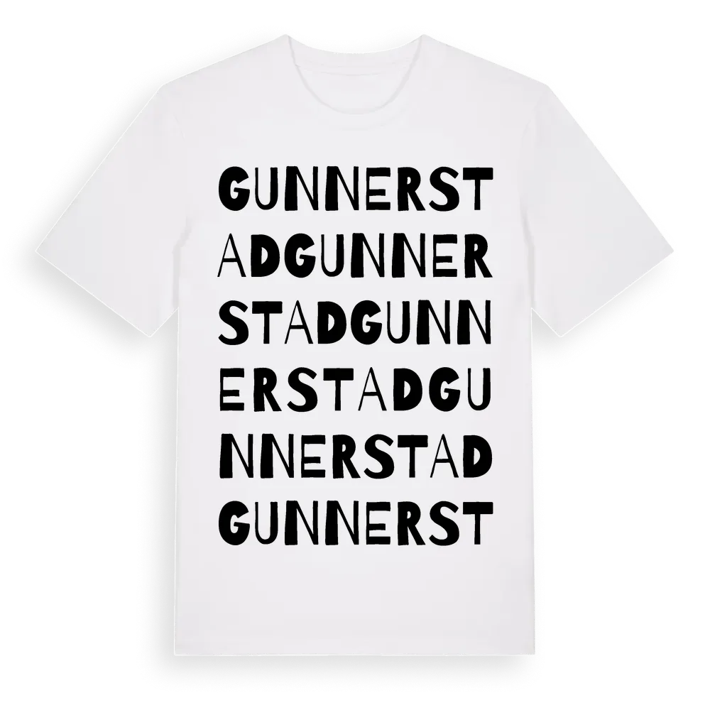 Gunnerstad ordlek t-shirt är inspirerad av byn Gunnerstad i Kalmar län, Sverige. Tröjan är designad för dig som har en speciell koppling till platsen – oavsett om du bor här, har rötterna här eller bara älskar Gunnerstad.