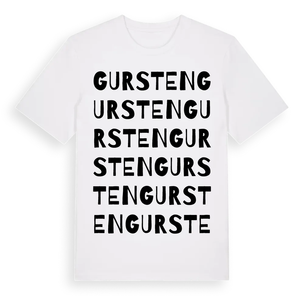Gursten ordlek t-shirt är inspirerad av byn Gursten i Kalmar län, Sverige. Tröjan är designad för dig som har en speciell koppling till platsen – oavsett om du bor här, har rötterna här eller bara älskar Gursten.