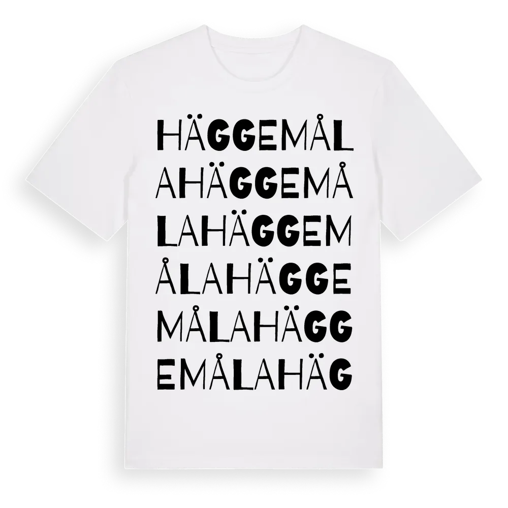 Häggemåla ordlek t-shirt är inspirerad av byn Häggemåla i Kalmar län, Sverige. Tröjan är designad för dig som har en speciell koppling till platsen – oavsett om du bor här, har rötterna här eller bara älskar Häggemåla.