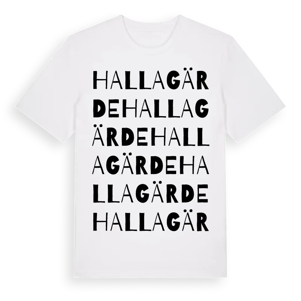 Hallagärde ordlek t-shirt är inspirerad av byn Hallagärde i Kalmar län, Sverige. Tröjan är designad för dig som har en speciell koppling till platsen – oavsett om du bor här, har rötterna här eller bara älskar Hallagärde.