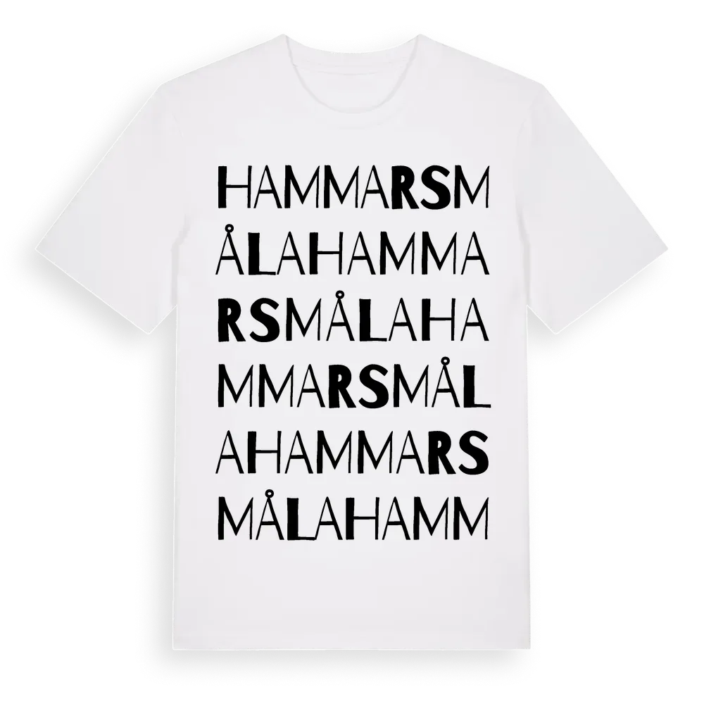 Hammarsmåla ordlek t-shirt är inspirerad av Hammarsmåla i Kalmar län, Sverige. Tröjan är designad för dig som har en speciell koppling till platsen – oavsett om du bor här, har rötterna här eller bara älskar Hammarsmåla.