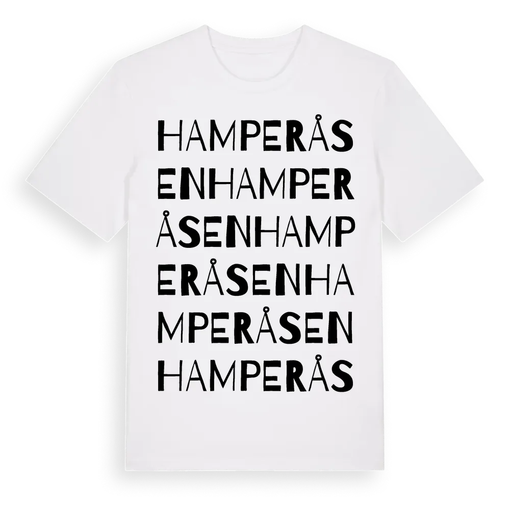 Hamperåsen ordlek t-shirt är inspirerad av Hamperåsen i Kalmar län, Sverige. Tröjan är designad för dig som har en speciell koppling till platsen – oavsett om du bor här, har rötterna här eller bara älskar Hamperåsen.