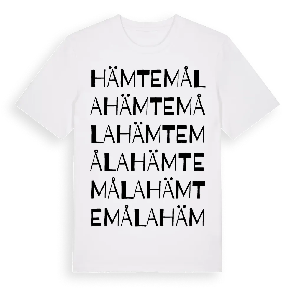 Hämtemåla ordlek t-shirt är inspirerad av Hämtemåla i Kalmar län, Sverige. Tröjan är designad för dig som har en speciell koppling till platsen – oavsett om du bor här, har rötterna här eller bara älskar Hämtemåla.