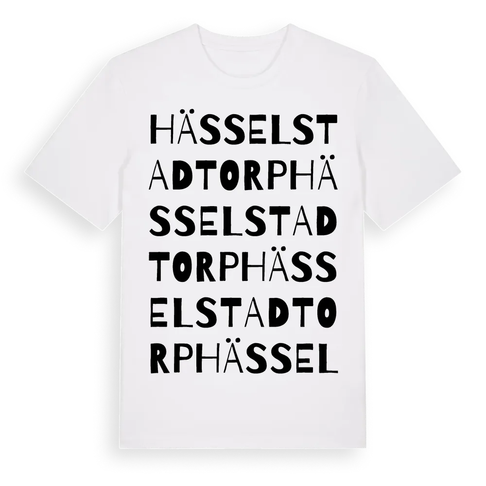 Hässelstadtorp ordlek t-shirt är inspirerad av Hässelstadtorp i Kalmar län, Sverige. Tröjan är designad för dig som har en speciell koppling till platsen – oavsett om du bor här, har rötterna här eller bara älskar Hässelstadtorp.