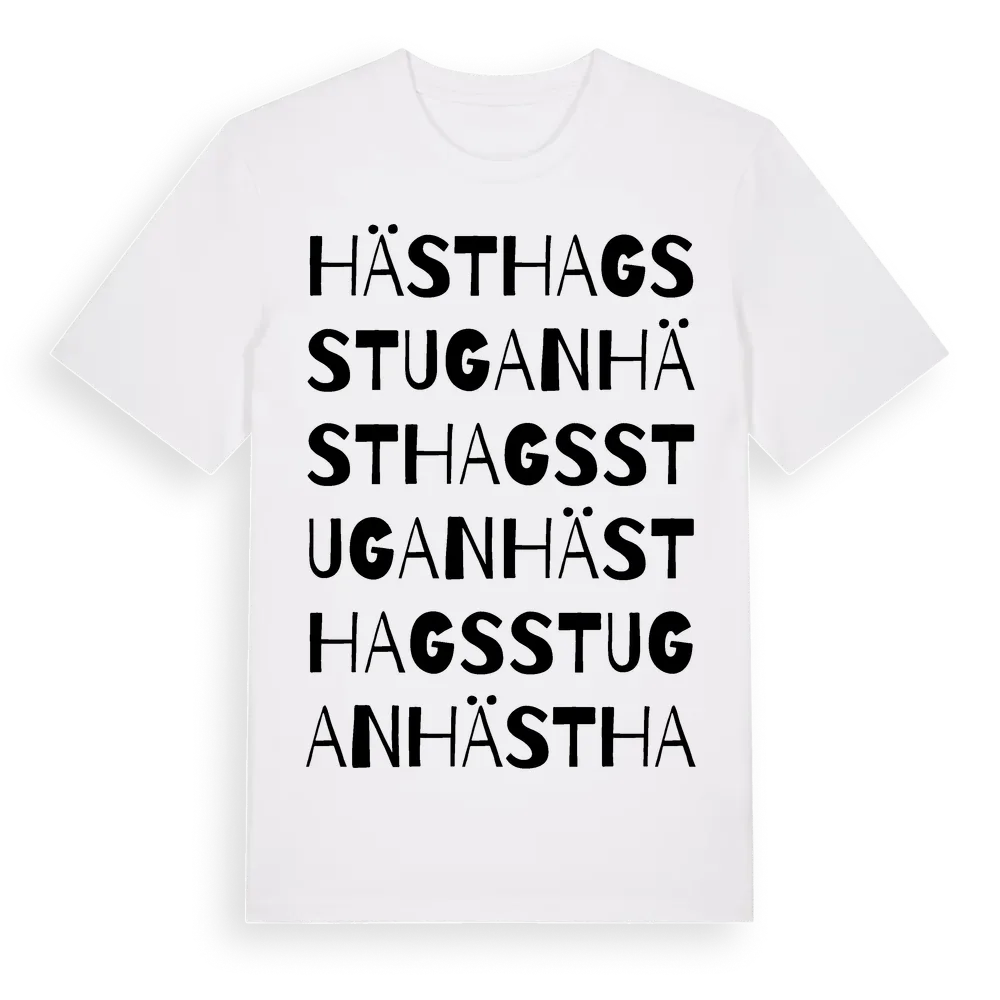Hästhagsstugan ordlek t-shirt är inspirerad av Hästhagsstugan i Kalmar län, Sverige. Tröjan är designad för dig som har en speciell koppling till platsen – oavsett om du bor här, har rötterna här eller bara älskar Hästhagsstugan.