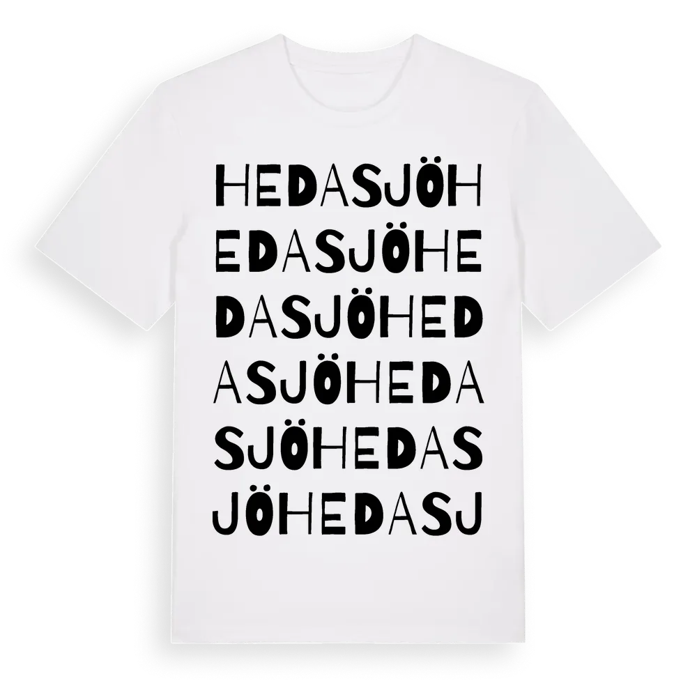 Hedasjö ordlek t-shirt är inspirerad av Hedasjö i Kalmar län, Sverige. Tröjan är designad för dig som har en speciell koppling till platsen – oavsett om du bor här, har rötterna här eller bara älskar Hedasjö.