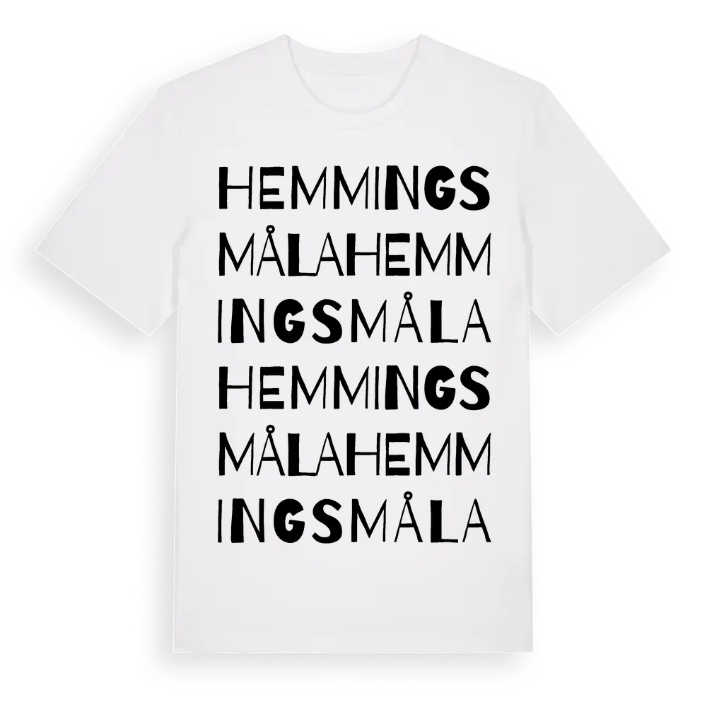 Hemmingsmåla ordlek t-shirt är inspirerad av Hemmingsmåla i Kalmar län, Sverige. Tröjan är designad för dig som har en speciell koppling till platsen – oavsett om du bor här, har rötterna här eller bara älskar Hemmingsmåla.