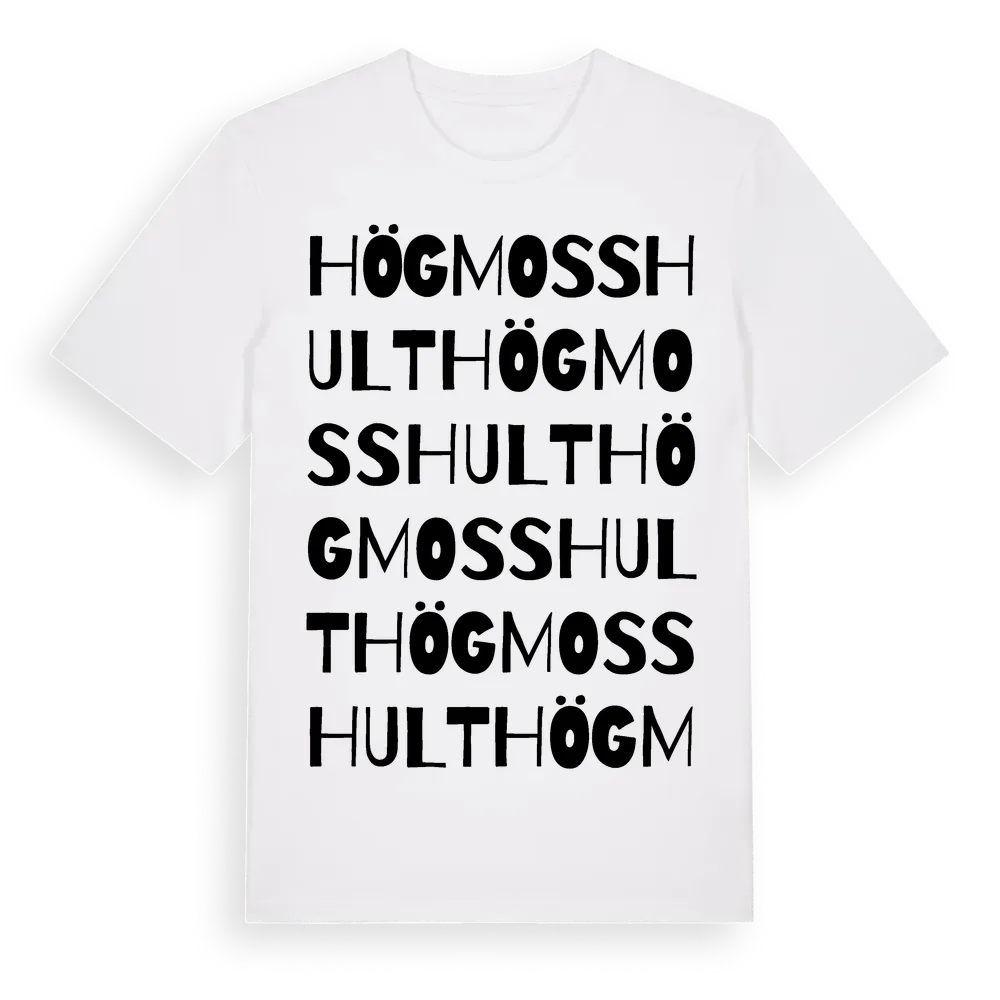 Högmosshult ordlek t-shirt är inspirerad av Högmosshult i Kalmar län, Sverige. Tröjan är designad för dig som har en speciell koppling till platsen – oavsett om du bor här, har rötterna här eller bara älskar Högmosshult.
