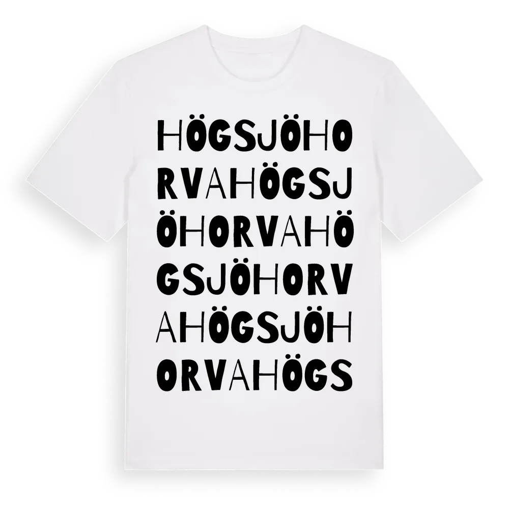 Högsjöhorva ordlek t-shirt är inspirerad av Högsjöhorva i Kalmar län, Sverige. Tröjan är designad för dig som har en speciell koppling till platsen – oavsett om du bor här, har rötterna här eller bara älskar Högsjöhorva.