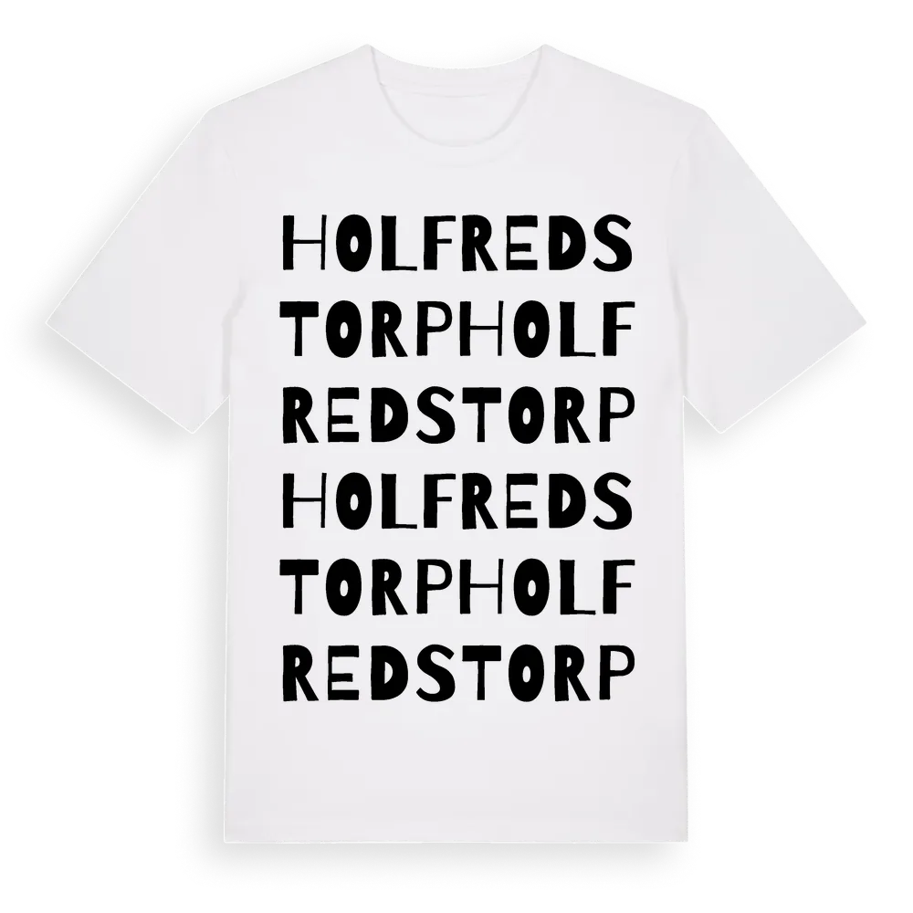 Holfredstorp ordlek t-shirt är inspirerad av byn Holfredstorp i Kalmar län, Sverige. Tröjan är designad för dig som har en speciell koppling till platsen – oavsett om du bor här, har rötterna här eller bara älskar Holfredstorp.