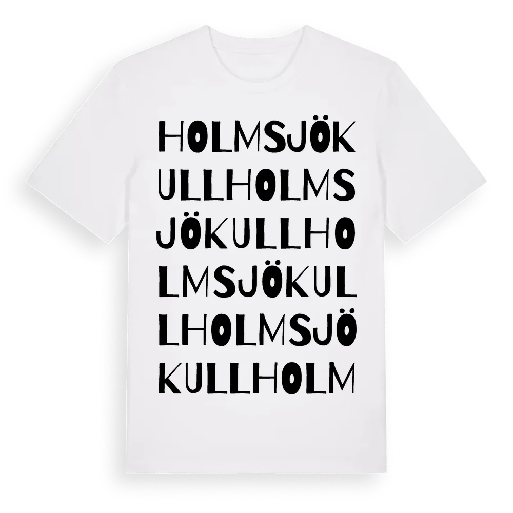 Holmsjökull ordlek t-shirt är inspirerad av Holmsjökull i Kalmar län, Sverige. Tröjan är designad för dig som har en speciell koppling till platsen – oavsett om du bor här, har rötterna här eller bara älskar Holmsjökull.