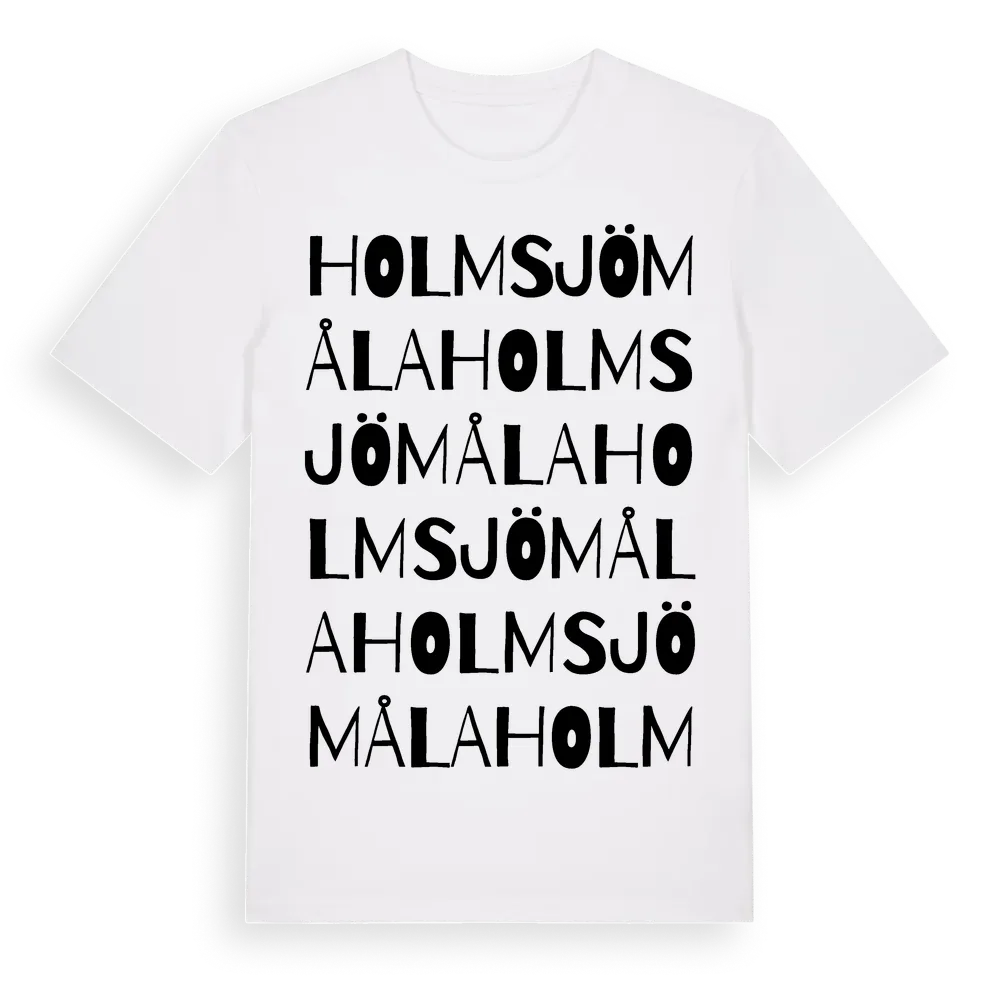 Holmsjömåla ordlek t-shirt är inspirerad av Holmsjömåla i Kalmar län, Sverige. Tröjan är designad för dig som har en speciell koppling till platsen – oavsett om du bor här, har rötterna här eller bara älskar Holmsjömåla.