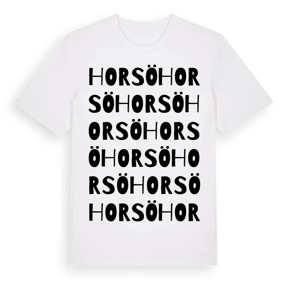 En ordlek byggd på Horsös namn. Subtilt och klurig – ett motiv som bara de som verkligen känner platsen fullt ut förstår. Premium bomull, unisex – från byn Horsö i Kalmar län.