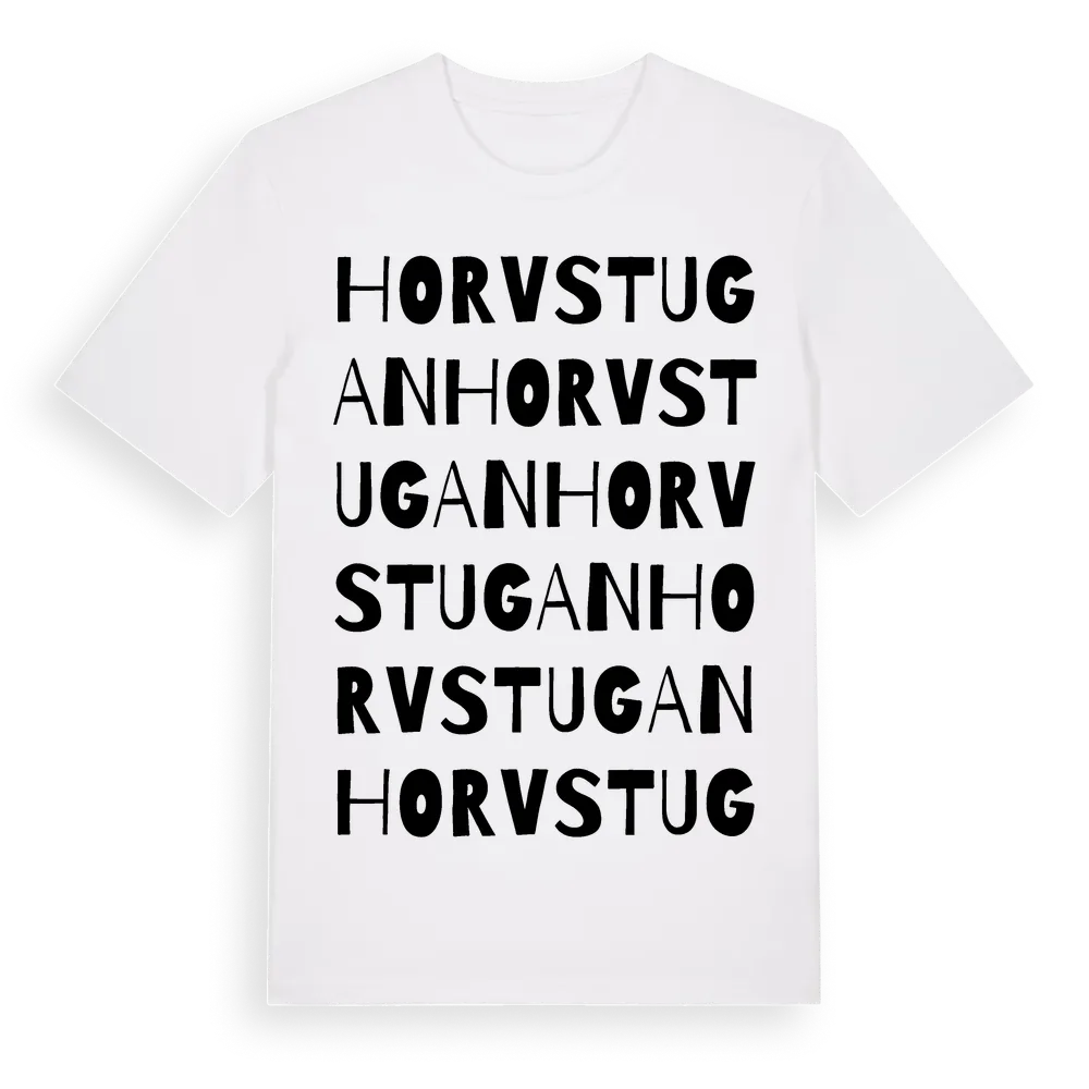 Horvstugan ordlek t-shirt är inspirerad av Horvstugan i Kalmar län, Sverige. Tröjan är designad för dig som har en speciell koppling till platsen – oavsett om du bor här, har rötterna här eller bara älskar Horvstugan.