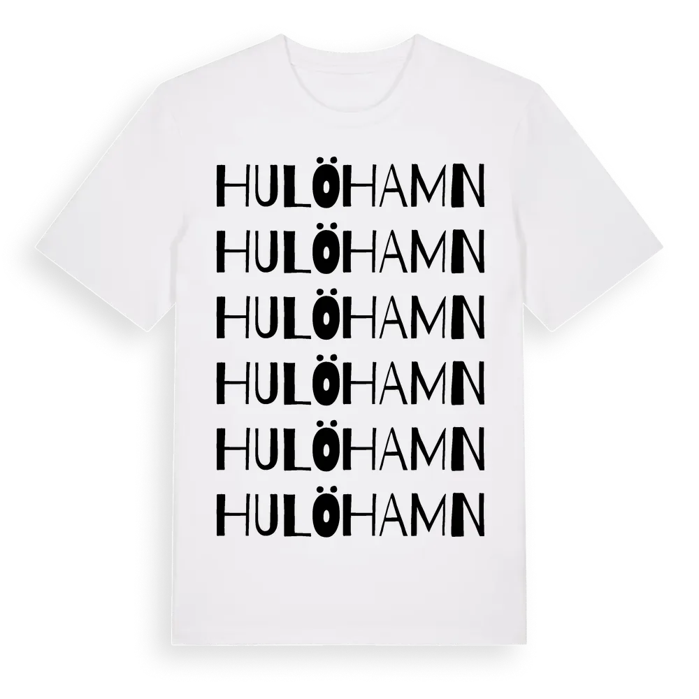 En ordlek byggd på Hulöhamns namn. Subtilt och klurig – ett motiv som bara de som verkligen känner platsen fullt ut förstår. Premium bomull, unisex – från byn Hulöhamn i Kalmar län.