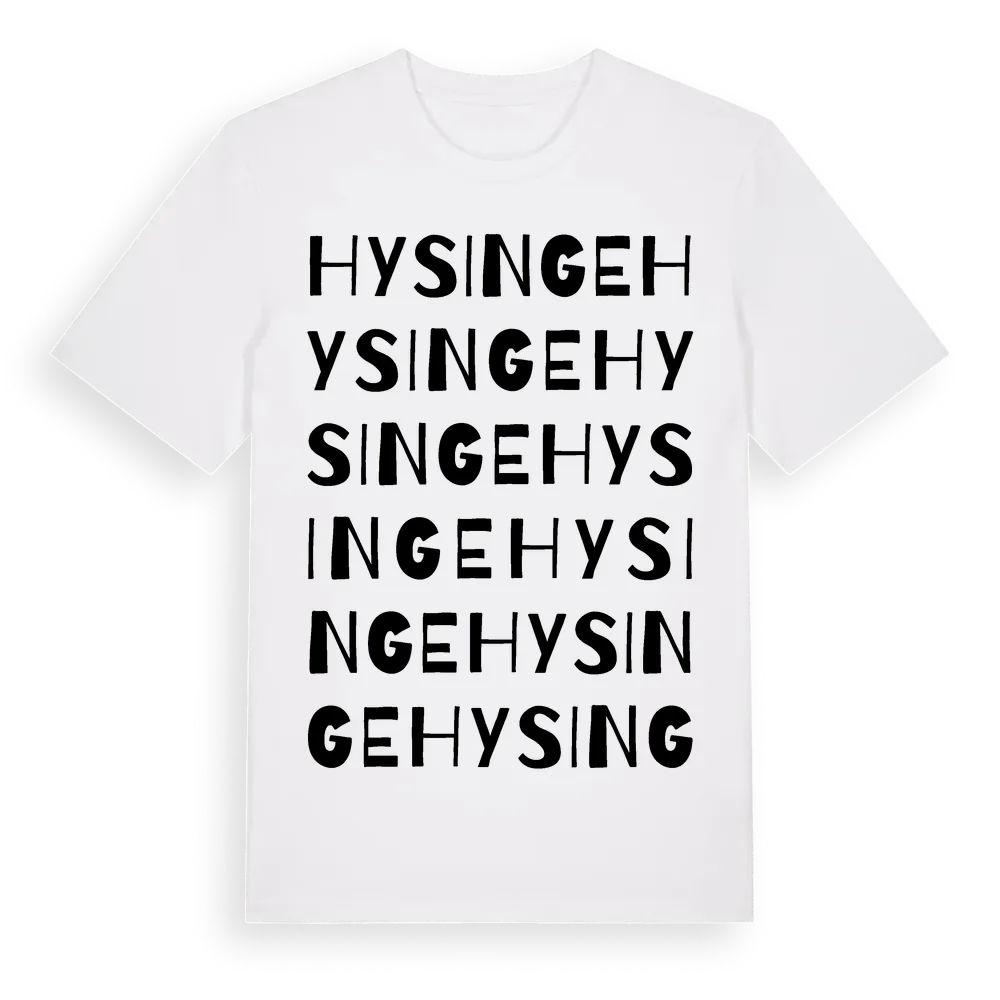 Hysinge ordlek t-shirt är inspirerad av Hysinge i Kalmar län, Sverige. Tröjan är designad för dig som har en speciell koppling till platsen – oavsett om du bor här, har rötterna här eller bara älskar Hysinge.
