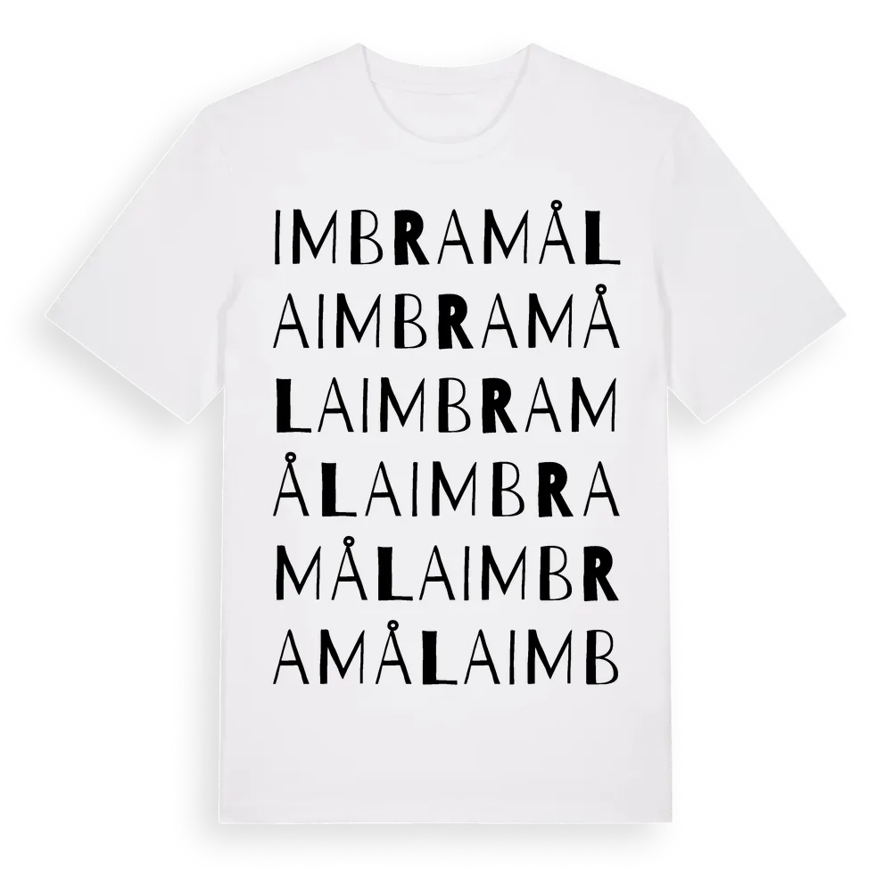 Imbramåla ordlek t-shirt är inspirerad av Imbramåla i Kalmar län, Sverige. Tröjan är designad för dig som har en speciell koppling till platsen – oavsett om du bor här, har rötterna här eller bara älskar Imbramåla.