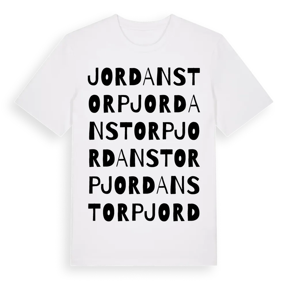 Jordanstorp ordlek t-shirt är inspirerad av Jordanstorp i Kalmar län, Sverige. Tröjan är designad för dig som har en speciell koppling till platsen – oavsett om du bor här, har rötterna här eller bara älskar Jordanstorp.