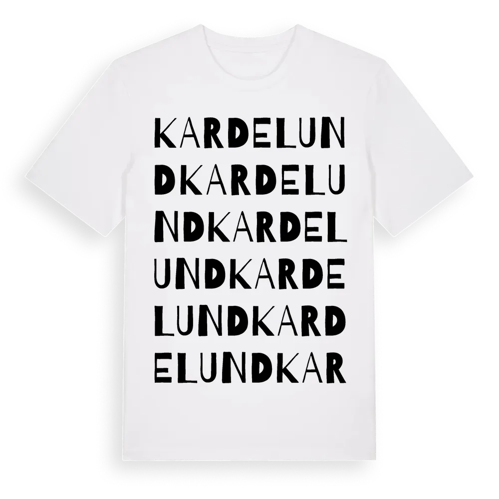 Kardelund ordlek t-shirt är inspirerad av Kardelund i Kalmar län, Sverige. Tröjan är designad för dig som har en speciell koppling till platsen – oavsett om du bor här, har rötterna här eller bara älskar Kardelund.