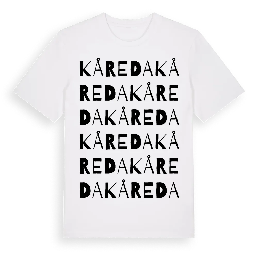 Kåreda ordlek t-shirt är inspirerad av byn Kåreda i Kalmar län, Sverige. Tröjan är designad för dig som har en speciell koppling till platsen – oavsett om du bor här, har rötterna här eller bara älskar Kåreda.
