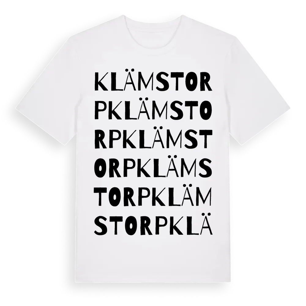 Klämstorp ordlek t-shirt är inspirerad av Klämstorp i Kalmar län, Sverige. Tröjan är designad för dig som har en speciell koppling till platsen – oavsett om du bor här, har rötterna här eller bara älskar Klämstorp.