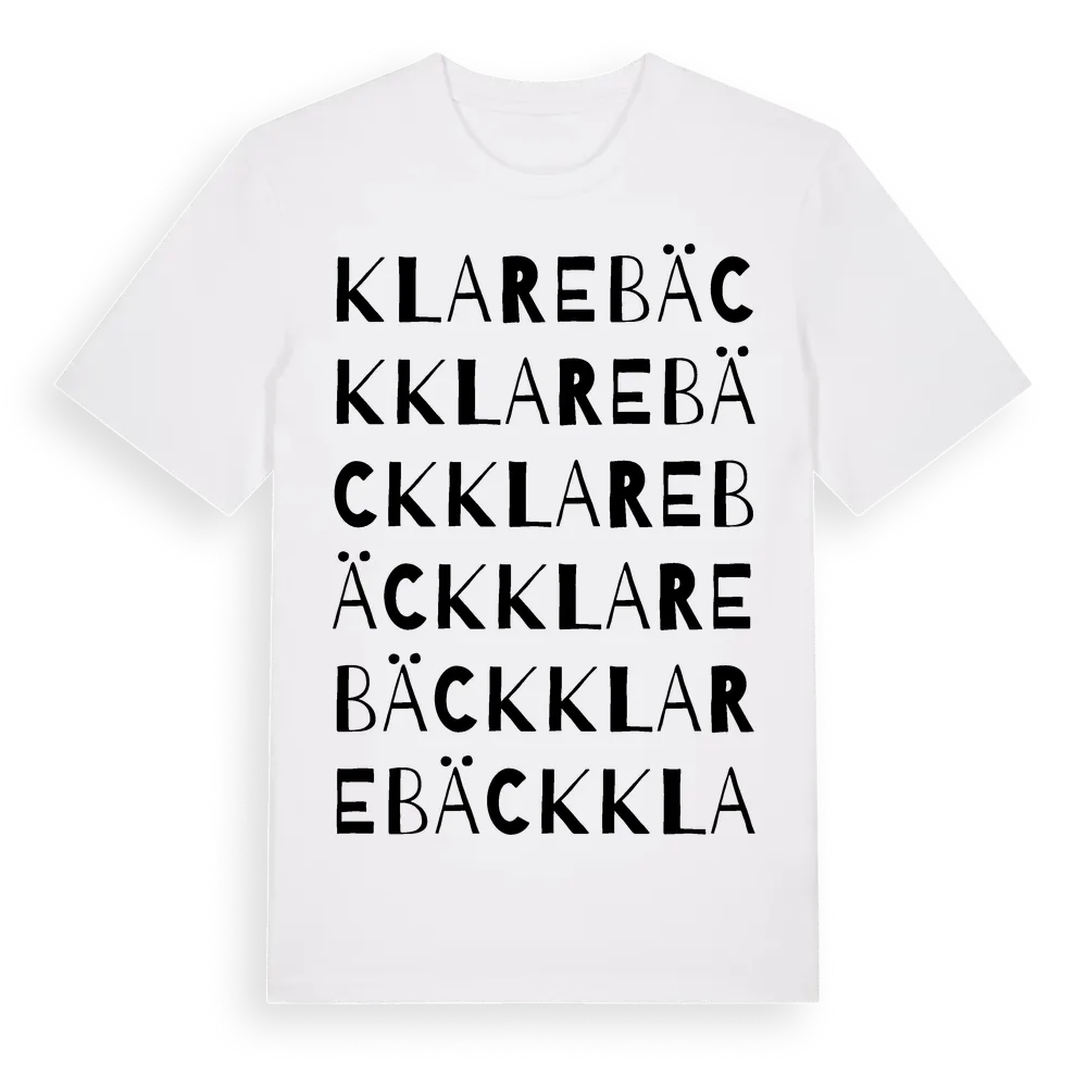 Klarebäck ordlek t-shirt är inspirerad av Klarebäck i Kalmar län, Sverige. Tröjan är designad för dig som har en speciell koppling till platsen – oavsett om du bor här, har rötterna här eller bara älskar Klarebäck.