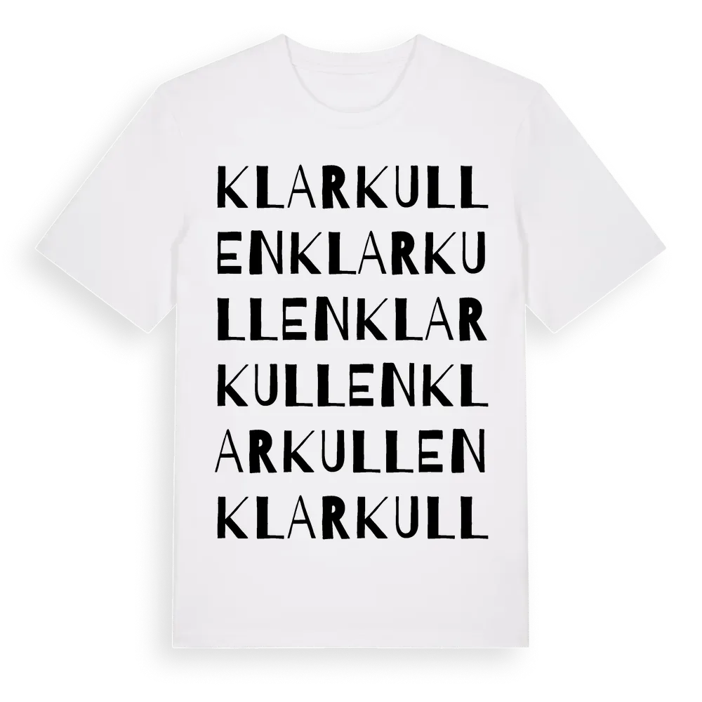Klarkullen ordlek t-shirt är inspirerad av Klarkullen i Kalmar län, Sverige. Tröjan är designad för dig som har en speciell koppling till platsen – oavsett om du bor här, har rötterna här eller bara älskar Klarkullen.
