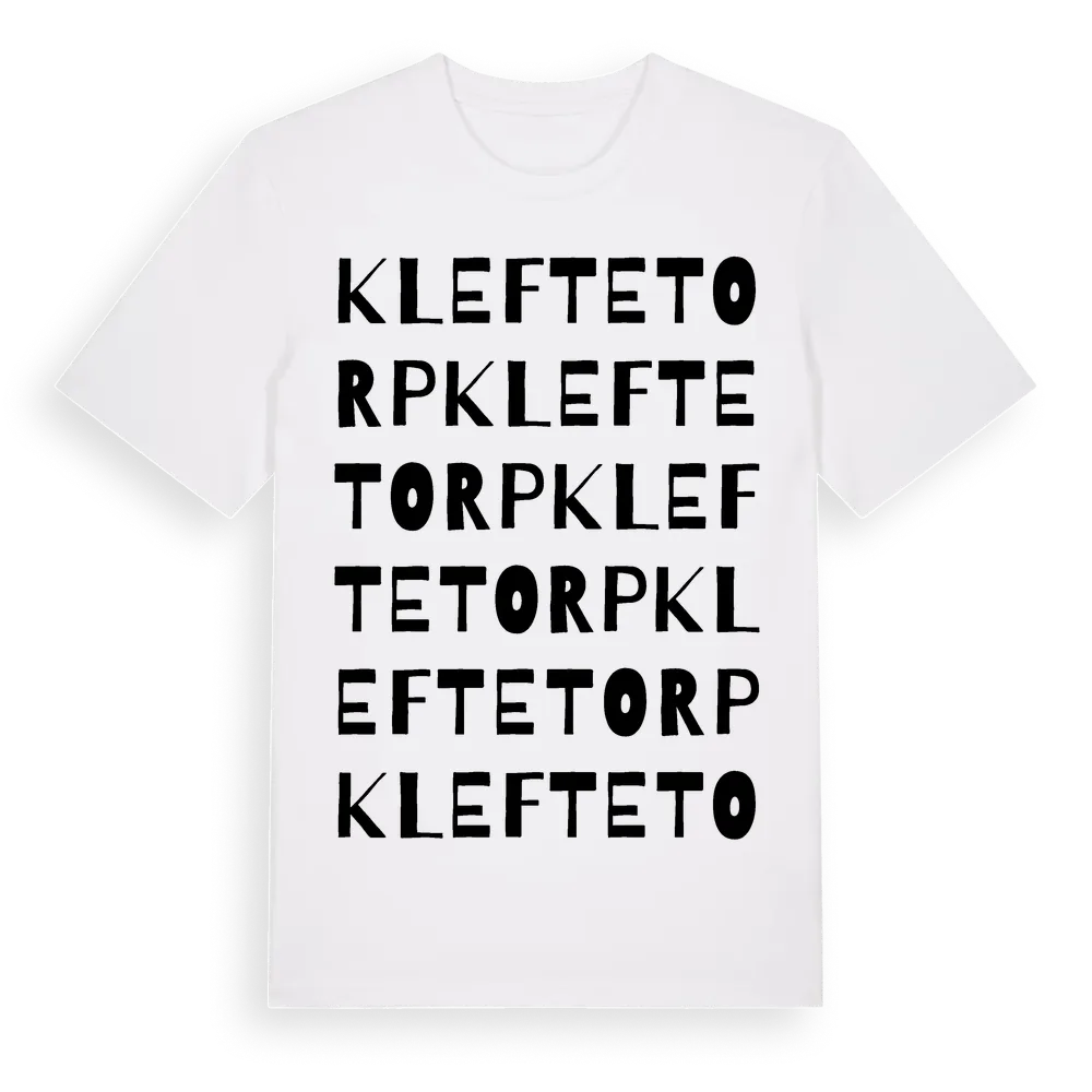 Kleftetorp ordlek t-shirt är inspirerad av byn Kleftetorp i Kalmar län, Sverige. Tröjan är designad för dig som har en speciell koppling till platsen – oavsett om du bor här, har rötterna här eller bara älskar Kleftetorp.